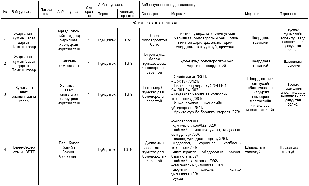 ТӨРИЙН ЖИНХЭНЭ АЛБАН ТУШААЛД ШИЛЖҮҮЛЭН АВАХ АЖЛЫН БАЙРНЫ ЖАГСААЛТ