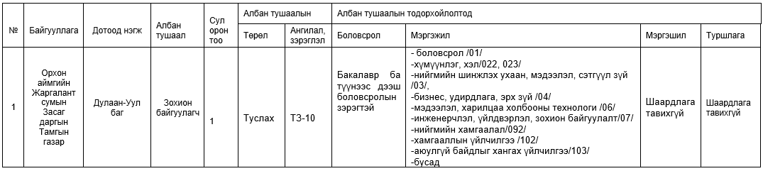 ТӨРИЙН ЖИНХЭНЭ АЛБАН ТУШААЛД ШИЛЖҮҮЛЭН АВАХ АЖЛЫН БАЙРНЫ ЖАГСААЛТ