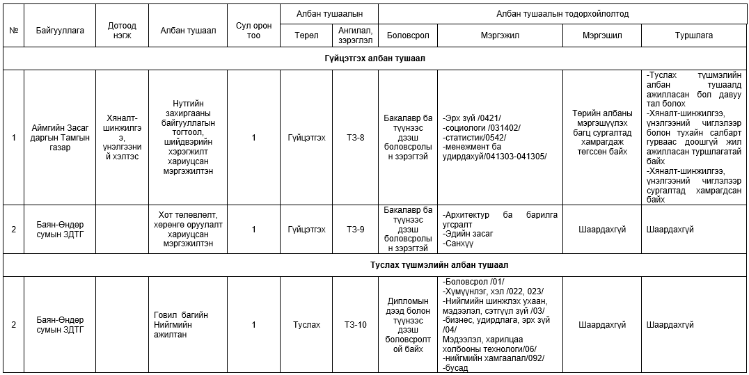 Төрийн албаны зөвлөлийн 2023 оны 25 дугаар тогтоолоор батлагдсан Төрийн албаны шалгалт өгөх болзол болон шатлан дэвшүүлэх, сонгон шалгаруулах журмын 4 дүгээр зүйлийн 4.2-т заасны дагуу төрийн өөр байгууллага, нэгж хооронд шилжин ажиллахыг хүссэн төрийн холбогдох бусад байгууллагад ажиллаж байгаа төрийн жинхэнэ албан хаагчдыг дараах албан тушаалд холбогдох материалаа цахим шуудангаар ирүүлэхийг урьж байна.
