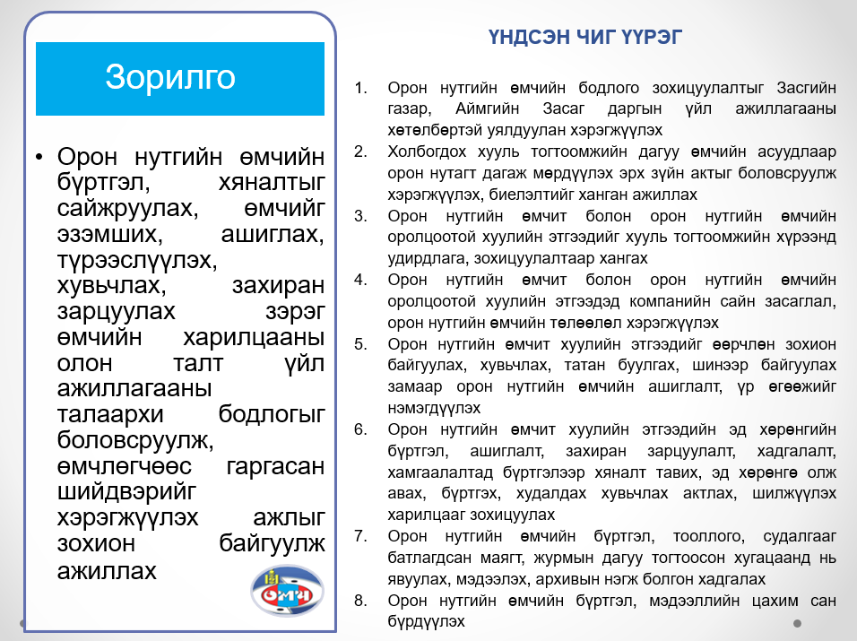 | 2 | М.Мөнхзаяа | Өмчийн ашиглалт, зохицуулалт хариуцсан мэргэжилтэн | 70352023 | 201б |
