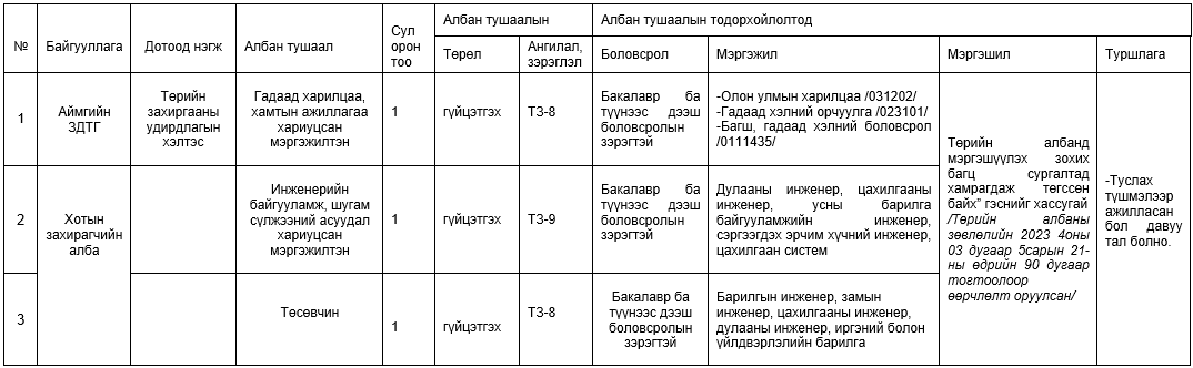 Төрийн албаны зөвлөлийн 2023 оны 25 дугаар тогтоолоор батлагдсан Төрийн албаны шалгалт өгөх болзол болон шатлан дэвшүүлэх, сонгон шалгаруулах журмын 4 дүгээр зүйлийн 4.2-т заасны дагуу төрийн өөр байгууллага, нэгж хооронд шилжин ажиллахыг хүссэн төрийн холбогдох бусад байгууллагад ажиллаж байгаа төрийн жинхэнэ албан хаагчдыг дараах албан тушаалд холбогдох материалаа цахим шуудангаар ирүүлэхийг урьж байна.