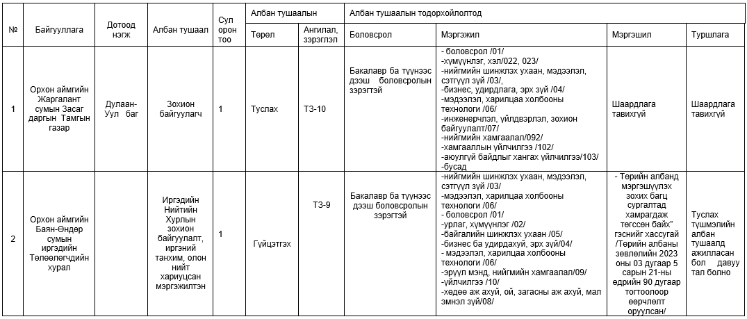 Төрийн албаны зөвлөлийн 2023 оны 25 дугаар тогтоолоор батлагдсан Төрийн албаны шалгалт өгөх болзол болон шатлан дэвшүүлэх, сонгон шалгаруулах журмын 4 дүгээр зүйлийн 4.2-т заасны дагуу төрийн өөр байгууллага, нэгж хооронд шилжин ажиллахыг хүссэн төрийн холбогдох бусад байгууллагад ажиллаж байгаа төрийн жинхэнэ албан хаагчдыг дараах албан тушаалд холбогдох материалаа цахим шуудангаар ирүүлэхийг урьж байна.